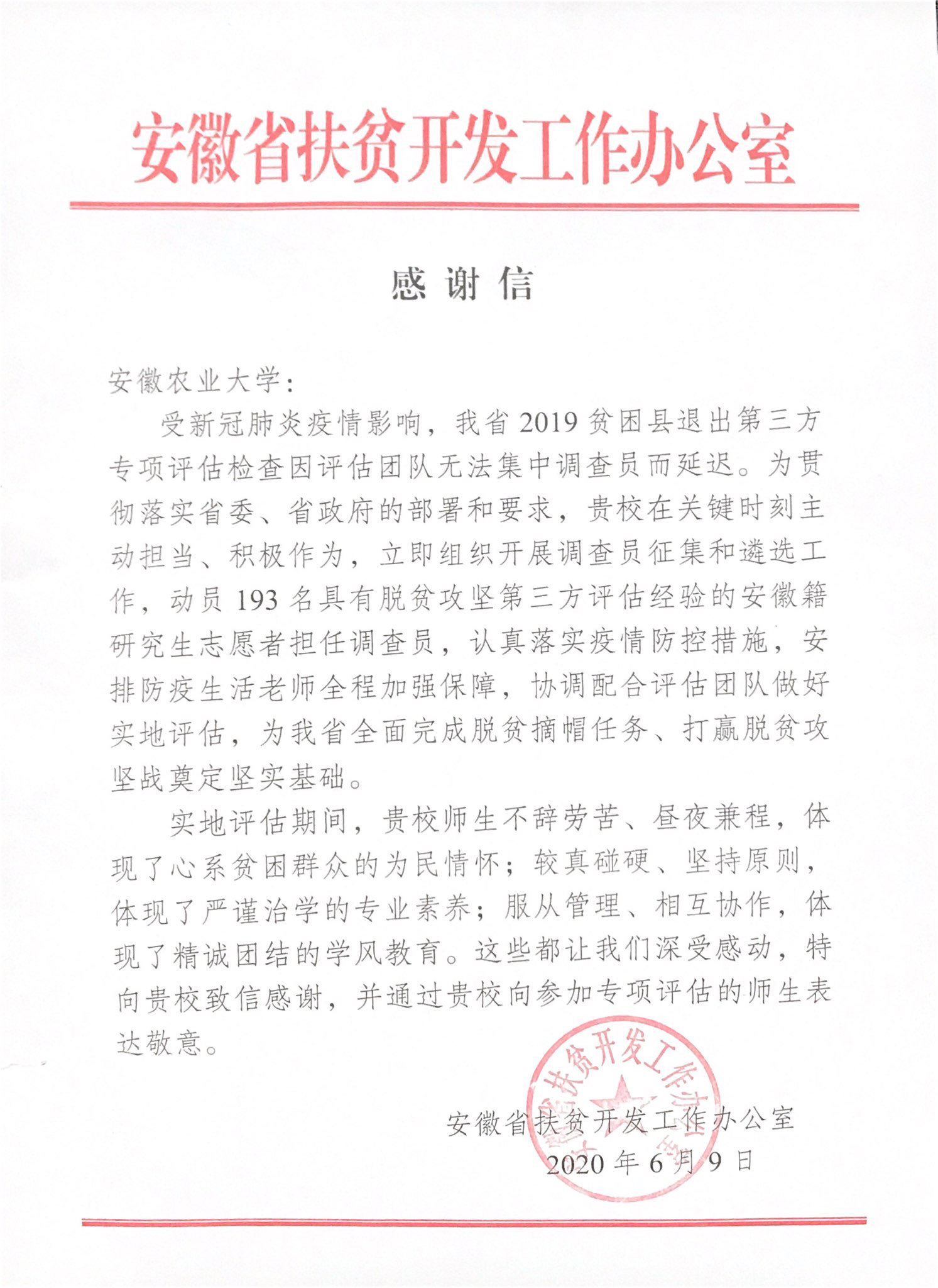 日前,省扶贫开发工作办公室发来感谢信,对我校在新冠肺炎疫情关键时刻,主动担当,积极作为,科学防控,周密组织193名师生,协调配合评估团队圆满完成脱贫攻坚第三方监测评估工作表示感谢,并对实地评估期间,我校参评师生心系贫困群众的为民情怀、严谨治学的专业素养和精诚团结的学风教育表达敬意。(新农村发展研究院)