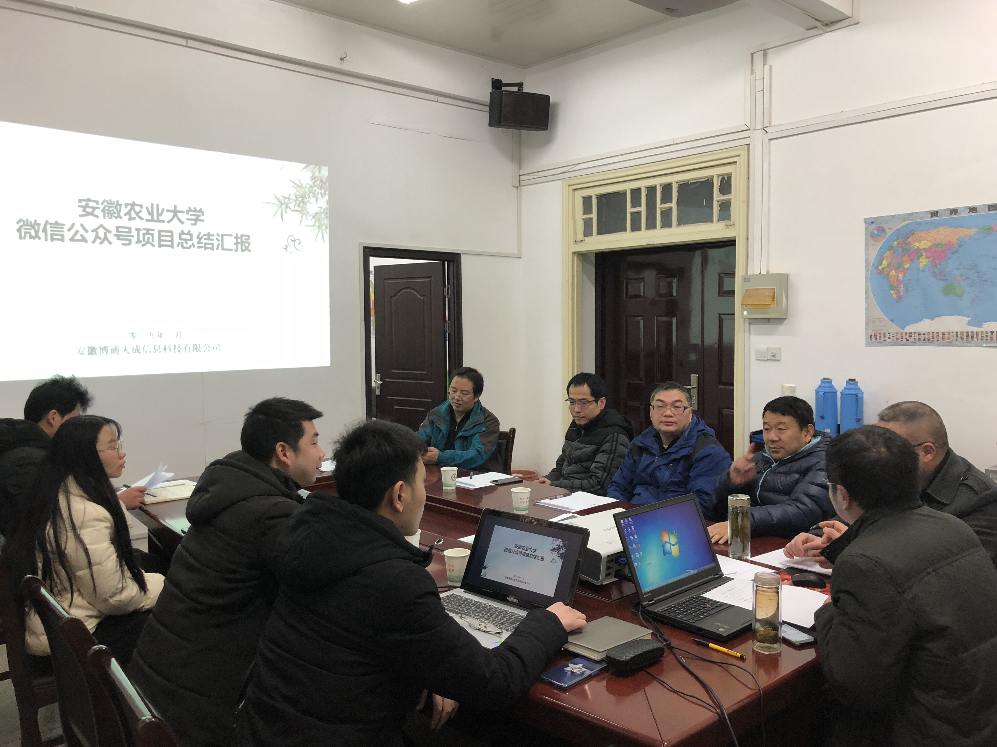 会上,安徽博通天成信息科技有限公司魏渡俊汇报项目实施及部署情况,并介绍了微信公众号的相关功能。新农村发展研究院工作人员汇报了微信公众号试运行期间的使用情况,并提出微信公众号需要完善的功能。