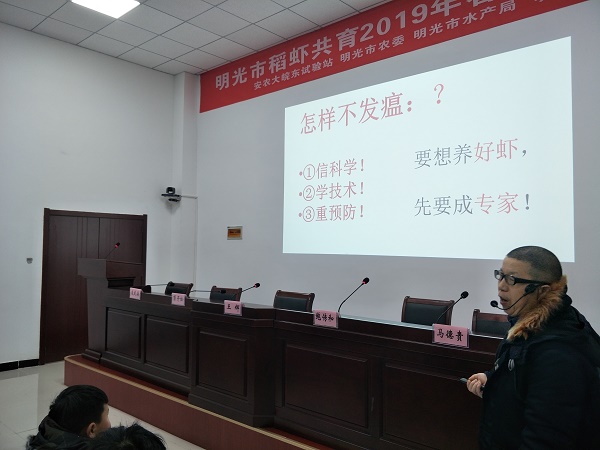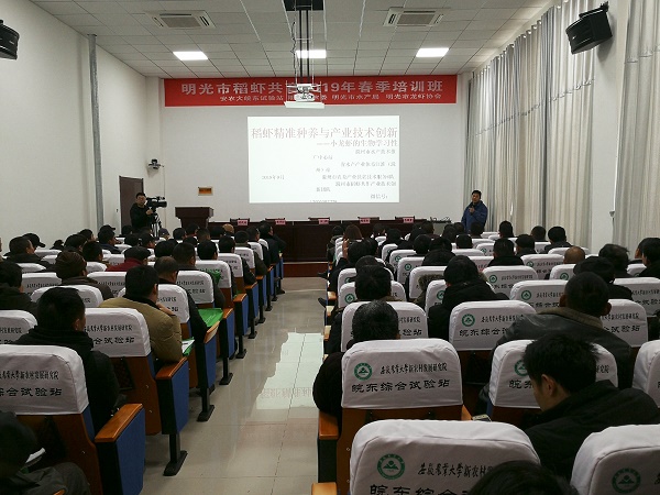 2月15日,明光市稻虾共育技术2019年春季培训班在安徽农业大学皖东综合试验站顺利开班。此次培训班由安农大皖东综合试验站联合明光市农委、明光市水产局、明光市龙虾产业协会、安农大·明光市水产产业联盟共同举办,来自明光市112名稻虾共育种养殖户参加了培训。培训班上,滁州市水产技术推广站站长凌武海讲授了《稻虾共育精准作业》技术和安农大动科学院副教授彭开松讲授了《稻虾养殖失败与病害分析》课程;水产产业联盟首席专家鲍传和连同两位授课专家进行了现场答疑。