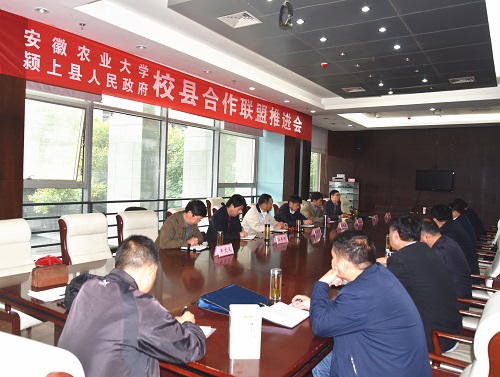 本网讯 10月17日下午,安徽农业大学与颍上县人民政府联合召开校县合作联盟推进会。副校长马传喜、颍上县县委副书记陈锐出席会议,会议由颍上县县委副书记陈锐主持。