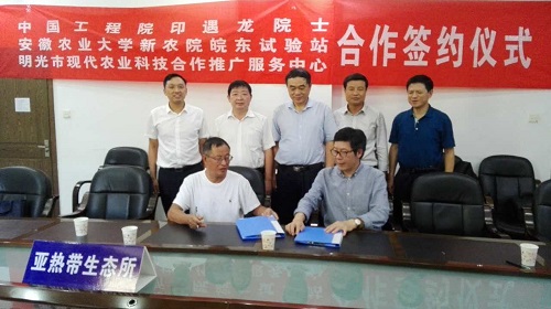 本网讯 10月1日上午,安徽农业大学皖东综合试验站(明光市现代农业科技合作推广服务中心)“院士工作站”合作签约仪式在湖南长沙举行,中国科学院亚热带农业生态研究所所长、中国工程院院士印遇龙与我校副校长姚佐文签署合作协议,明光市副市长司学军出席仪式。