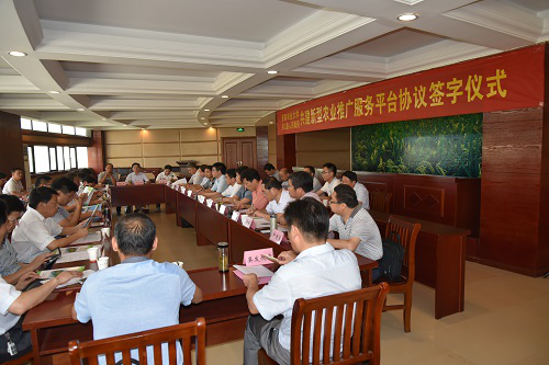 副校长姚佐文、庐江县副县长苏少春代表双方签订了《安徽农业大学·庐江县人民政府共建新型农业推广服务平台协议书》。
