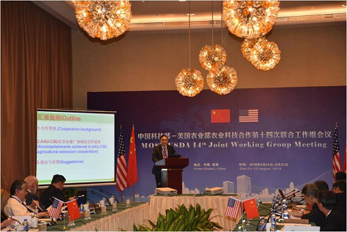 本网讯 2016年8月25日,中国科技部-美国农业部农业科技合作第十四次联合工作组会议在广东珠海召开。校党委书记宛晓春教授率姚佐文副校长、新农院负责人等应邀参加了会议。中国科技部副部长徐南平和美国农业部副部长凯瑟琳·渥特基(Catherine Woteki)出席会议并讲话,广东省人民政府副省长袁宝成参加会议并致辞。