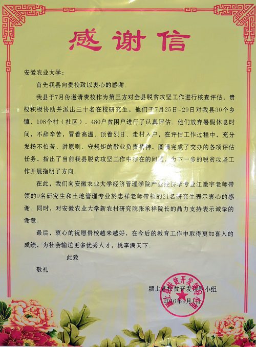 本网讯 近日,颍上县扶贫开发领导小组向我校发来感谢信,感谢我校师生冒着高温酷暑为该县脱贫攻坚工作进行第三方核查评估。7月25-29日,应颍上县人民政府邀请,在新农村发展研究院组织协调下,经济管理学院江激宇、於忠祥两位教授率队开展了此项工作。