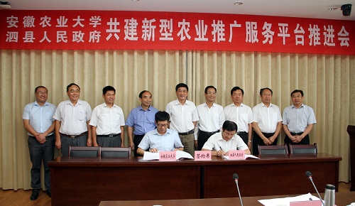 本网讯 9月18日上午,我校与泗县人民政府合作共建新型农业推广服务平台签约仪式在第三会议室举行。校党委书记宛晓春、校长程备久、副校长姚佐文、泗县县委书记张志强、县长王法立出席仪式并讲话。仪式由副校长马传喜主持。姚佐文副校长、王法立县长分别代表校县双方签订了合作共建新型农业推广服务平台协议书。泗县人大常委会主任刘中平、县政协主席孙茂盛一同参加签约仪式。