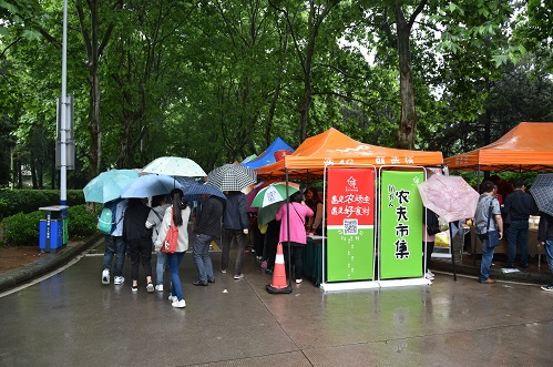 新农人农夫市集受到我校师生、周边居民、外国专家和留学生的广泛欢迎。当天的霏霏细雨没能浇灭“赶集”者的参与热情,他们犹如潮水从四面八方涌入校园,市集现场人头攒动,交易场面火爆。