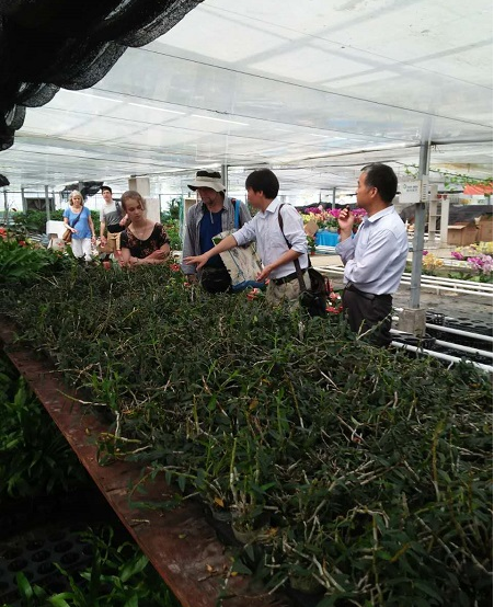在农萃园,马元山从青年农场主班创新创业基地耕地应用到果树新品种培育,从鲜花生产到大棚冷帘降温,从花卉育苗水肥一体化到自动雾化喷灌,为美国师生进行了详细讲解。美国师生对我校培育的黄色蝴蝶兰、白掌以及霍山石斛产生了浓郁的兴趣,他们看到了在美国看不到的特殊品种与大智能温室降温方法。