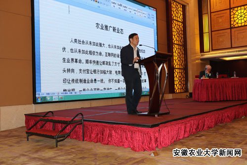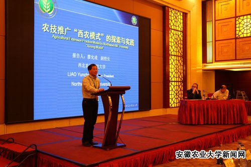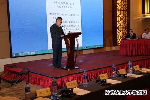 在大会研讨阶段,我校副校长姚佐文、美国科罗拉多州立大学副校长James Cooney共同主持了研讨会。我校党委书记宛晓春教授、美国科罗拉多州立大学副校长Lou Swanson等8位嘉宾分别作了大会主旨报告。宛晓春教授以“新型大学推广模式‘一站一盟一中心’的探索与实践”为题,向与会人员介绍了我校与地方合作共建新型农业推广服务平台的进展情况,并就如何以新型农业推广服务平台为载体实现双创型人才培养、农业科技创新和社会服务能力提升的有机统一进行了经验交流。科罗拉多州立大学Lou Swanson副校长、Alan Rudolph副校长、Raj Khosla教授、凯赛生物科技有限公司执行总裁Xiucai Liu,国务院参事室特约研究员刘奇教授,农业部农业技术推广服务中心科技与体系处田有国处长,西北农林大学廖允成副校长,金寨县汪冬县长,分别就中美农业推广合作、新型大学推广模式构建、校地产学研合作模式创新等主题进行了发言。同济大学、南京农业大学、东北农业大学、四川农业大学等20余位参会代表围绕大学农业推广和技术转移,在会上进行了深入交流。