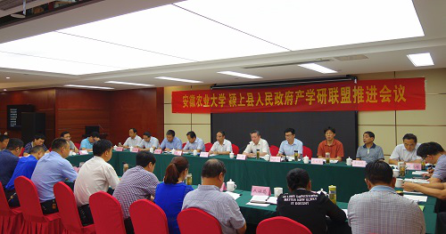 本网讯 7月11日上午,安徽农业大学•颍上县人民政府校县产学研联盟推进会在颍上县召开。校党委书记江春、校长程备久、副校长姚佐文、颍上县委副书记丁思彬、副县长吴建军出席会议并讲话。会议由颍上县委副书记丁思彬主持。