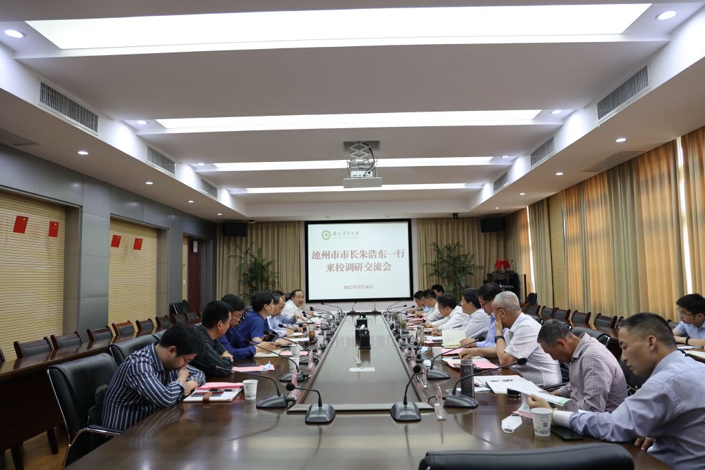 5月26日下午,池州市委副书记、市长朱浩东一行赴安徽农业大学就进一步深化校市合作进行调研交流。安徽农业大学党委书记常业军进行了会见,校长夏涛,党委常委、副校长操海群出席座谈会。会议由操海群主持。