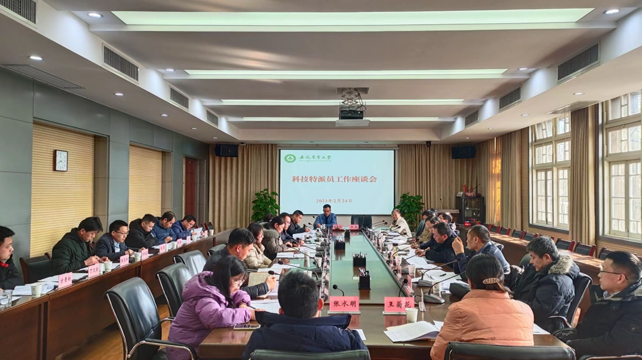 2023年2月24日下午,科技特派员工作座谈会在我校第三会议室召开,新农村发展研究院负责同志、34个省级科技特派团代表参加会议。