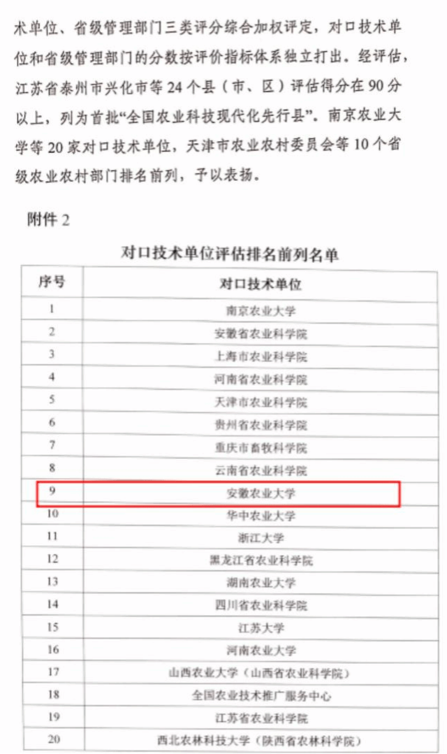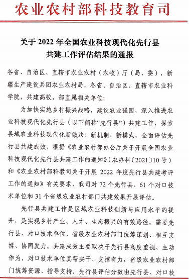 本网讯 4月17日,农业农村部科技教育司发布《关于2022年全国农业科技现代化先行县共建工作评估结果的通报》,公布了对72个先行县、61个对口技术单位和31个省级农业农村部门共建效果的考评结果,我校等20个对口技术单位获表扬。