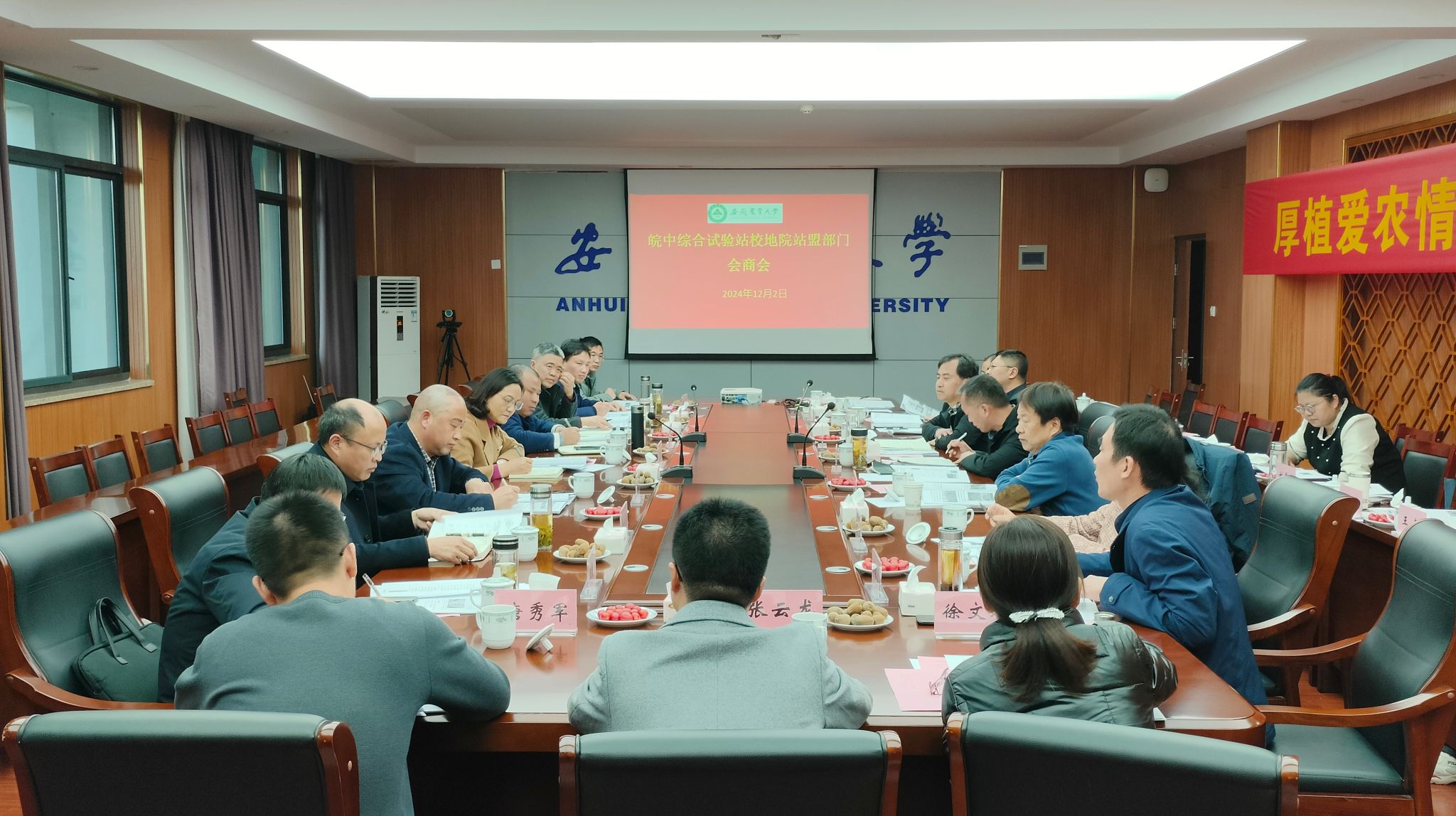 12月2日下午,安徽农业大学皖中综合试验站校地院站盟部门会商会在皖中综合试验站会议室召开,庐江县财政局、农业农村局、林园中心、供销社等有关部门,安徽农业大学农学院、园艺学院、植物保护学院、资源与环境学院等协同学院负责同志,社会合作处、皖中综合试验站等有关人员参加会议。会议由社会合作处分管负责人主持。
