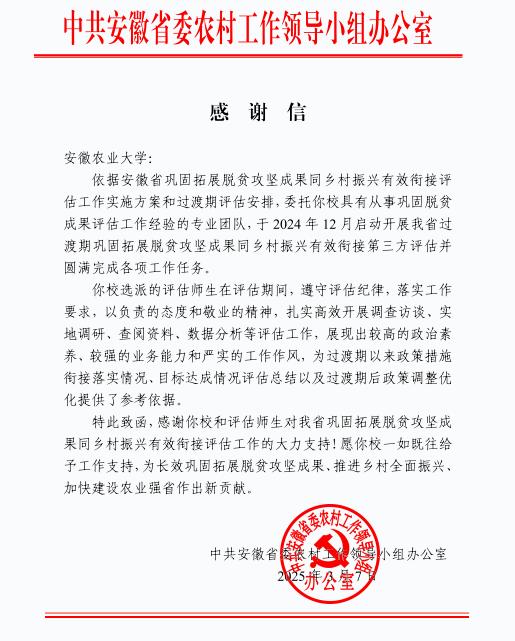 日前,省委农村工作领导小组办公室发来感谢信,对我校师生圆满完成2024年度安徽省脱贫攻坚与乡村振兴第三方评估任务表示感谢。信中称赞我校师生以负责的态度和敬业的精神,扎实高效开展调查访谈、实地调研、查阅资料、数据分析等评估工作,展现出较高的政治素养、较强的业务能力和严实的工作作风,为过渡期以来政策措施衔接落实情况、目标达成情况评估总结以及过渡期后政策调整优化提供了参考依据。