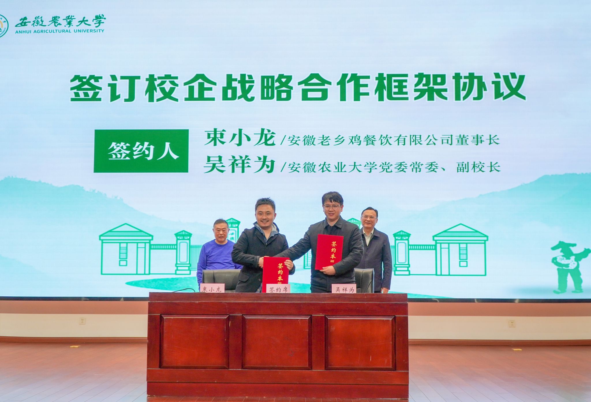 老乡鸡是中式快餐第一品牌,现代农业一二三产融合发展的标杆。我校与老乡鸡公司强强联合、双向奔赴,协同培养“老乡鸡新农人”,致力推动科技创新和产业创新深度融合,加快形成农业科技成果全产业链转化应用的大场景,携手为服务乡村全面振兴和江淮粮仓建设作出更大贡献。