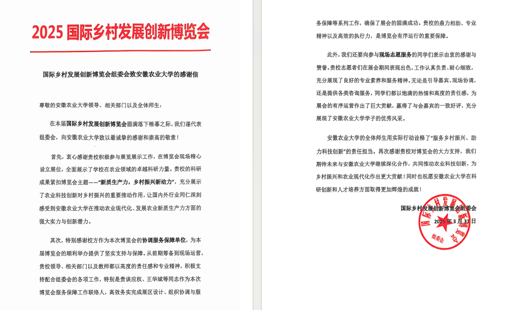 本网讯 近日,国际乡村发展创新博览会组委会向我校发来感谢信并赠送锦旗,对学校在2025国际乡村发展创新博览会中的大力支持表达诚挚的感谢和崇高的敬意。感谢信中说,学校积极参与的一系列展览及主题活动,全面展示了学校在农业领域的卓越科技力量。学校以专业的精神、高效的组织和卓越的服务,为博览会的成功举办提供了坚实支持与重要保障。期待今后双方继续深化合作,共同推进农业科技创新,为乡村振兴和农业农村现代化作出更大贡献。