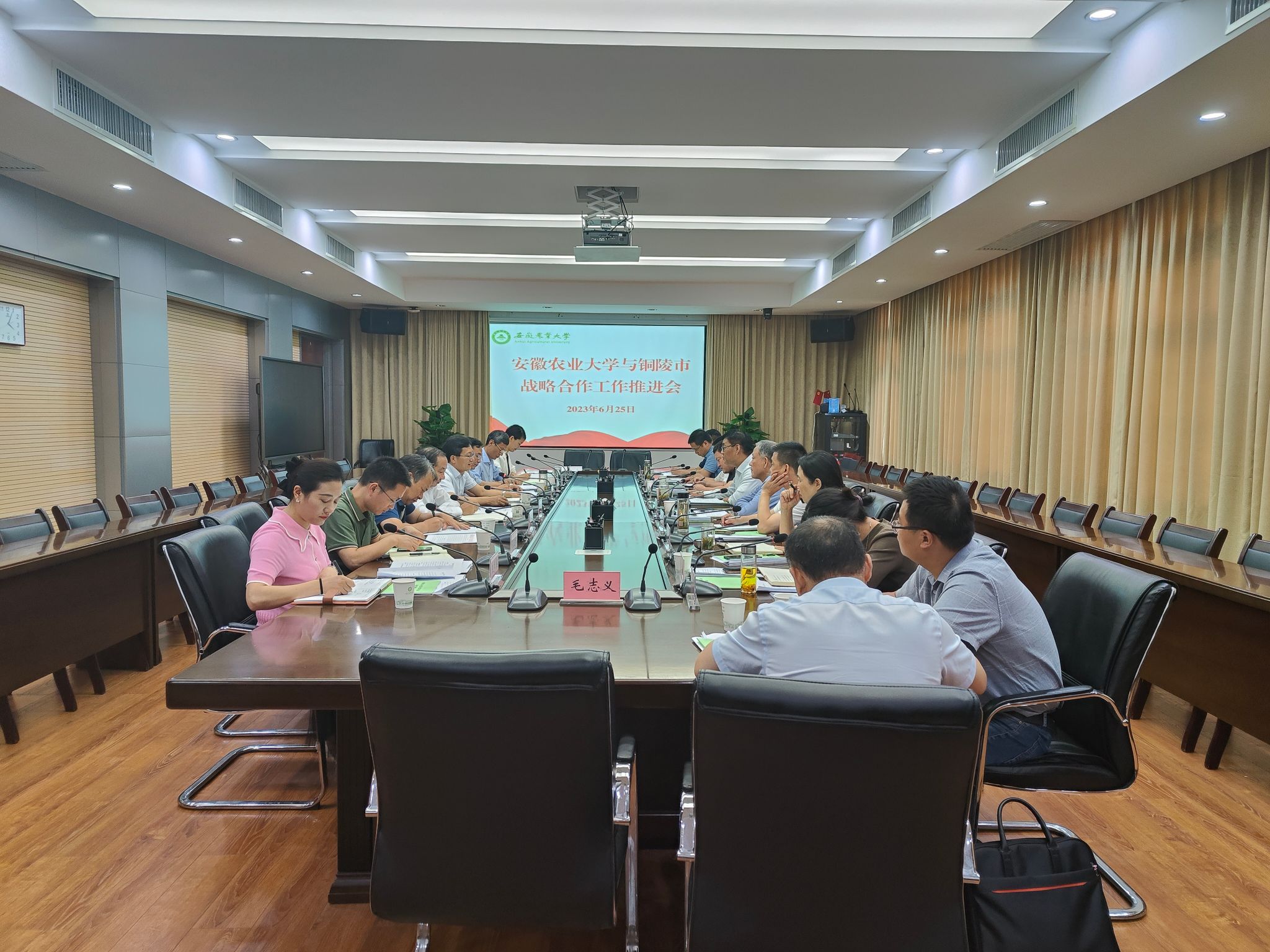 铜陵市政府办、农业农村局、科技局、普农集团,校新农院、科技处、高质量发展工作专班相关负责人参加会议。会上,双方就成立校市合作战略合作领导小组、铜陵研究院方案、铜陵市农业相关技术需求以及下一步工作安排等事项进行了深入交流。